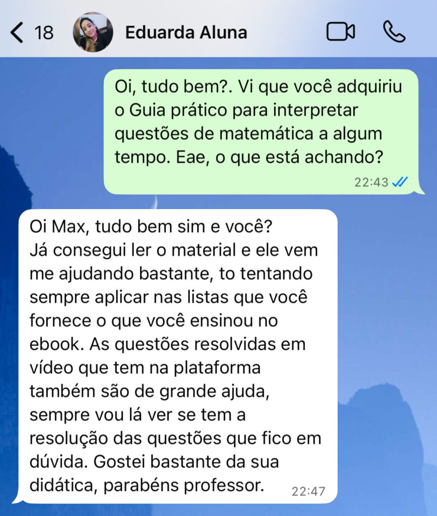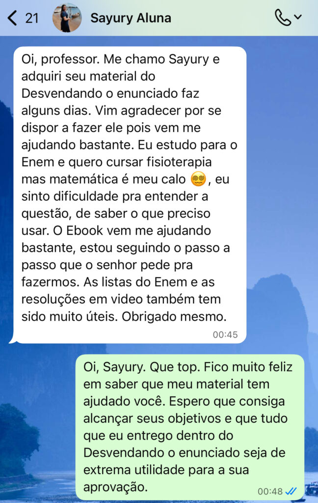 Meu foco é te mostrar que dá, sim, pra resolver questões do ENEM com eficácia e velocidade, sem enrolação, sem fórmulas soltas e sem perder horas quebrando a cabeça. Se você me der uma chance, eu te provo que a prova pode ser mais leve do que parece.