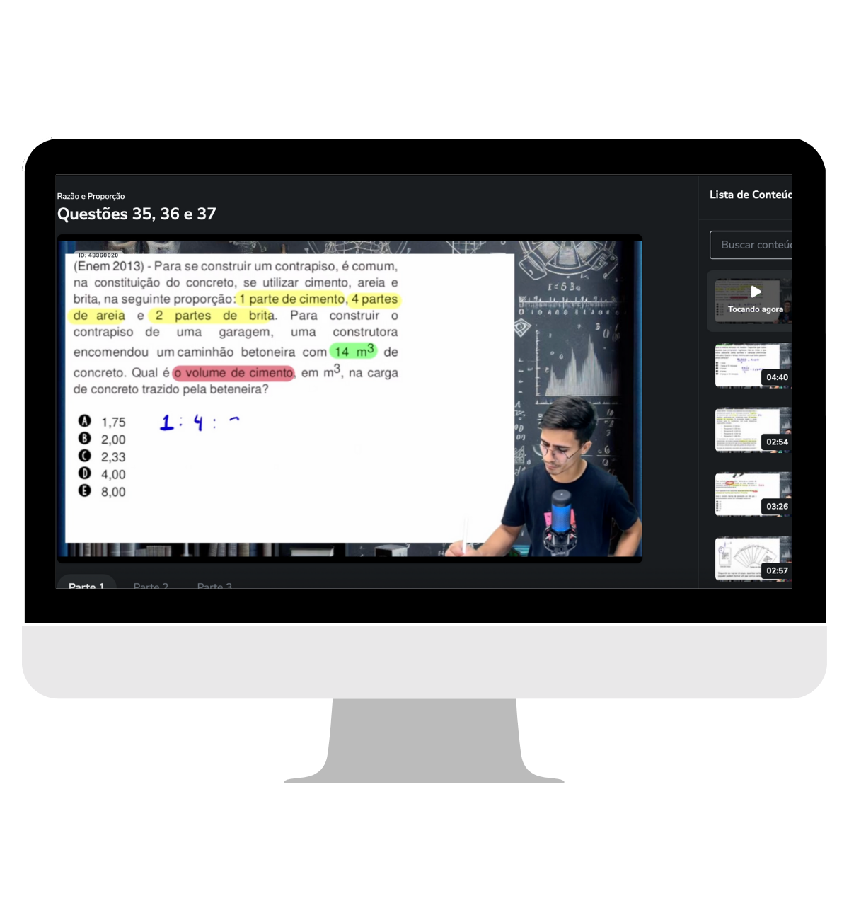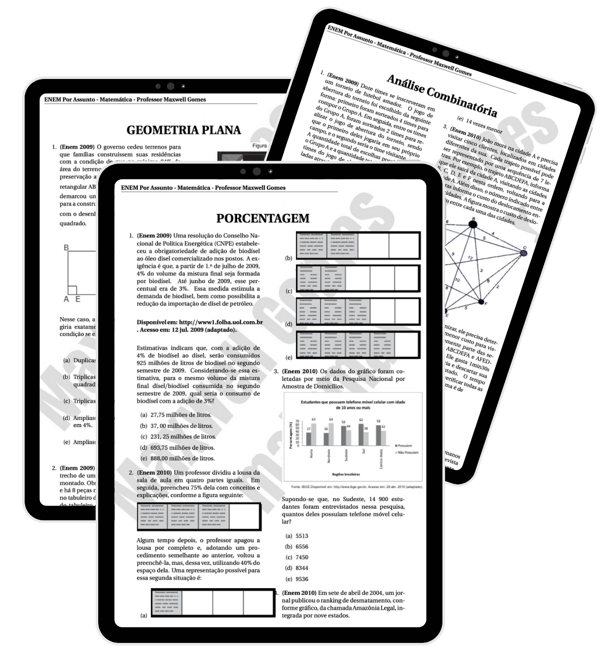 Você terá acesso a mais de 10 listas de exercícios com questões do ENEM todas separadas por assunto. Cada lista com seu determinado assunto (Porcentagem, Escala, Razão e Proporção, Funções...)